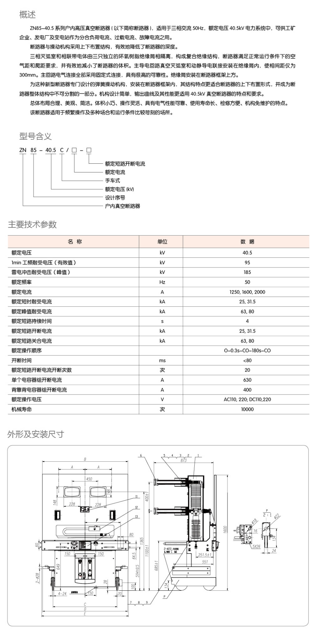 ZN85-40.5 series indoor high voltage vacuum circuit breaker is suitable for three-phase AC 50Hz, rated voltage 40.5kv power system, and can be used for switching load current, overload current and fault current in industrial and mining enterprises, power plants and substations. The circuit breaker and the operating mechanism adopt an up-and-down arrangement mechanism, which effectively reduces the depth of the circuit breaker.