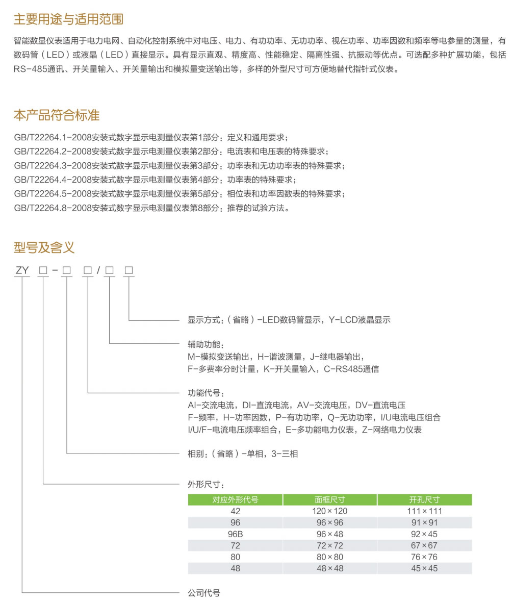 The intelligent digital display instrument is suitable for the measurement of voltage, electric power, active power, reactive power, apparent power, power factor and frequency in power grid and automatic control system. It has digital tube (LED) or liquid crystal (LED) direct display. It has the advantages of intuitive display, high precision, stable performance, strong isolation and anti vibration. It can be equipped with a variety of extended functions, including RS-485 communication, switch input, switch output and analog transmission output, etc.