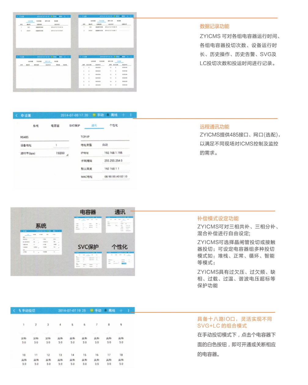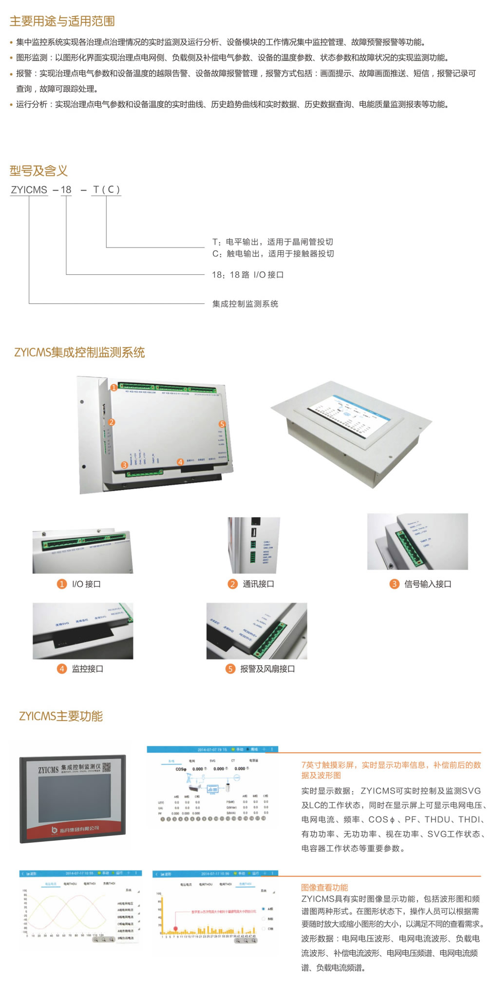 The centralized detection system realizes the functions of real-time detection and operation analysis of the governance situation of each governance point, centralized monitoring and management of the working situation of the equipment module, fault warning and alarm, etc. Graphic monitoring: the monitoring function of power grid side, load side and compensation electrical parameters, temperature parameters, state parameters and fault conditions of equipment can be realized by graphical interface. Alarm: to realize the control point electrical parameters and equipment temperature over limit warning, equipment fault alarm management, alarm mode includes: screen prompt, fault screen push, SMS, alarm record can be queried, fault can be tracked.