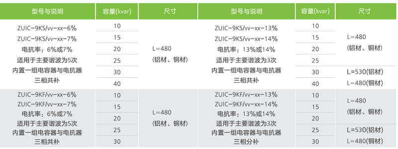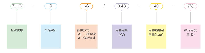 ZUIC-9KS/0.48-40-7%表示共補40kvar電容電壓480V串接7%電抗,三相補償用于380V系統。