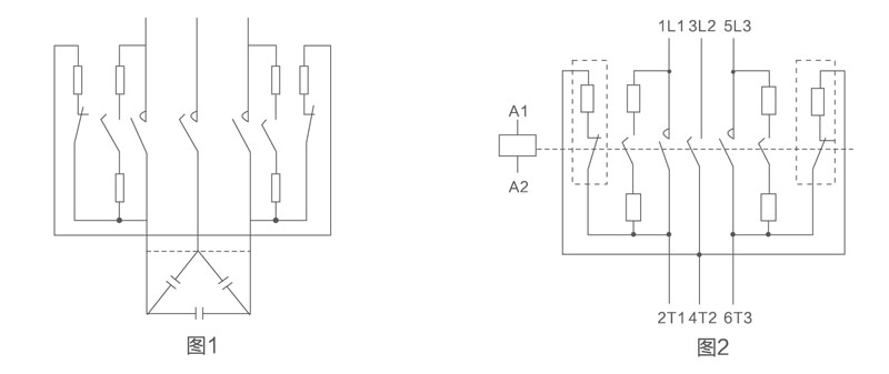 兩動(dòng)斷(常閉)觸頭與電阻組成放電電路,當接觸器吸合時(shí),該電阻與電容器斷開(kāi),釋放時(shí),電阻與電容器并接使電容器放電。B30C 型的電阻切合電路有兩路見(jiàn)(圖1),因為電容器內部為三角形連接,當電阻切合電路接通時(shí),每相電容電路均有電阻接入。