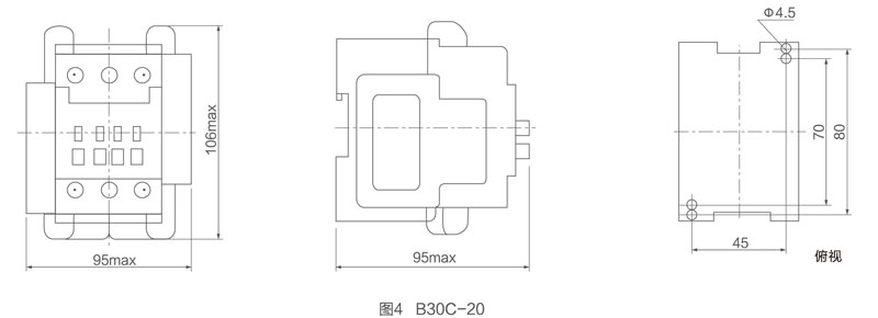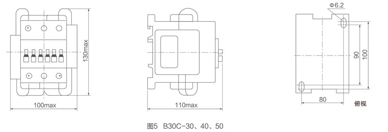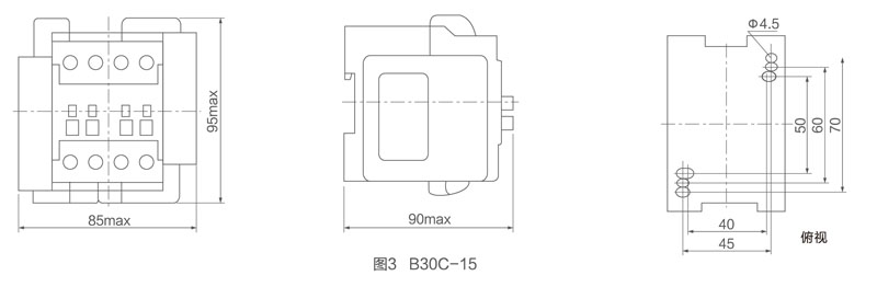 接觸器安裝方便,B30C-15、20型可用M4螺釘和防松墊圈安裝,也可使用35mm標準導軌安裝;B30C-30、40、50型可用M5螺釘及防松墊圈安裝,也可使用35mm或75mm標準導軌。