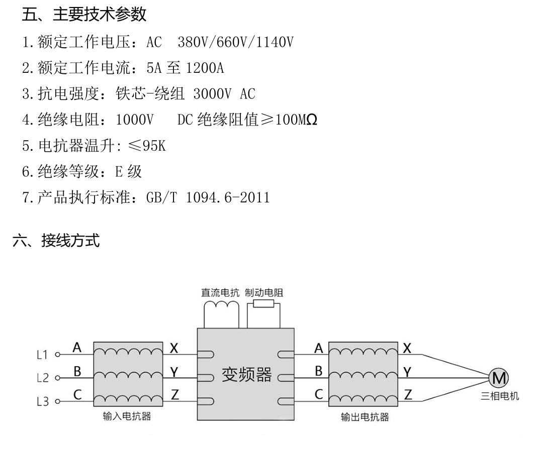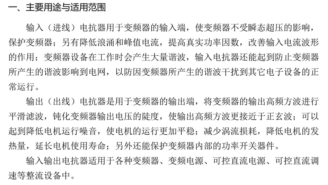 輸入(進(jìn)線(xiàn))電抗器用于變頻器的輸入端,使變頻器不受瞬態(tài)超壓的影響,保護變頻器;另有降低浪涌和峰值電流,提高真實(shí)功率因數,改善輸入電流波形的作用;變頻器設備在工作時(shí)會(huì )產(chǎn)生大量諧波,輸入電抗器還能起到防止變頻器所產(chǎn)生的諧波影響到電網(wǎng),以防因變頻器所產(chǎn)生的諧波干擾到其它電子設備的正常運行。