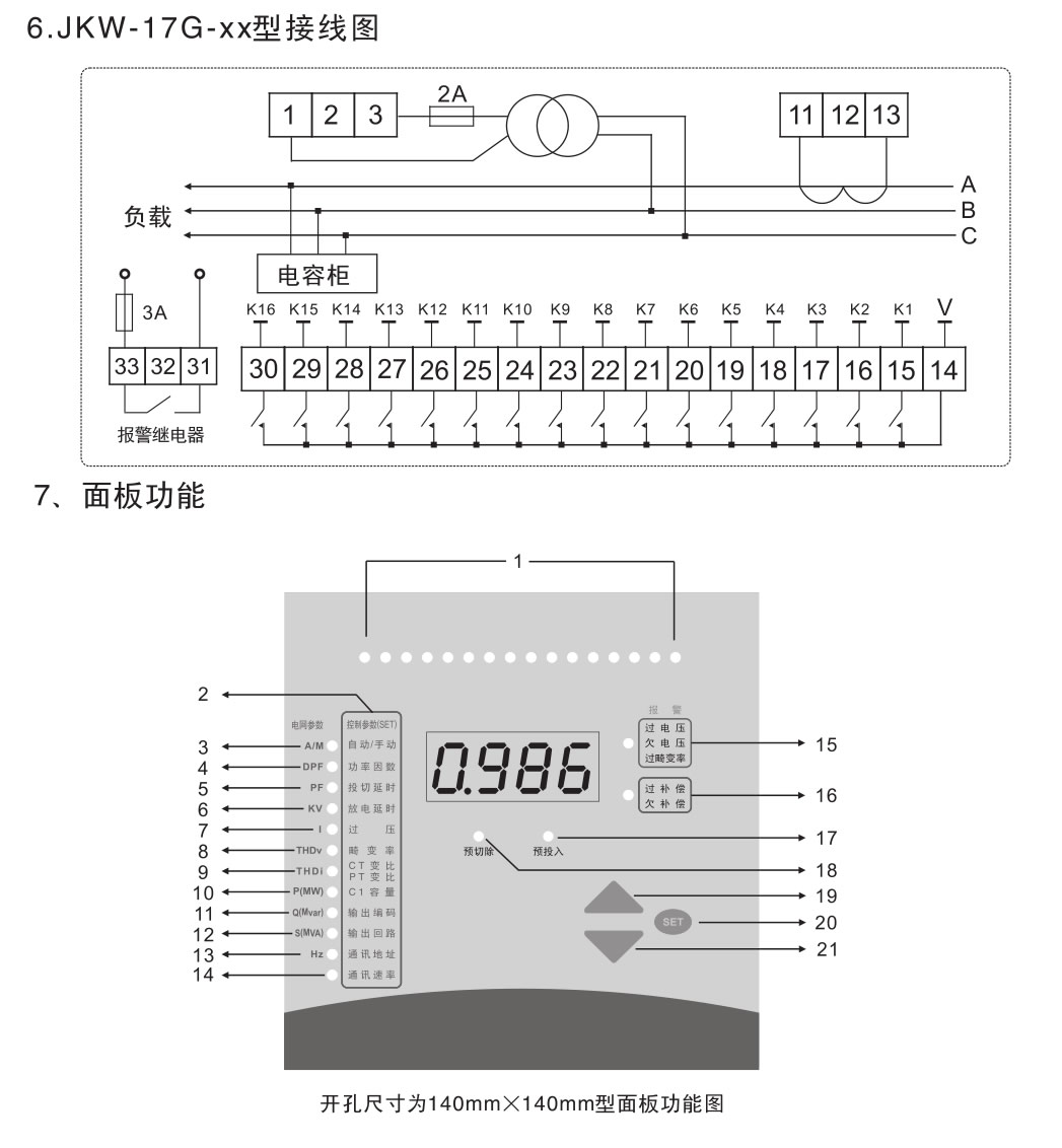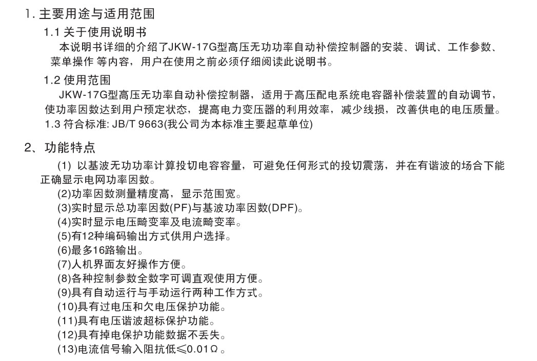 JKW-17G高壓無(wú)功率自動(dòng)補償控制器,適用于高壓配電系統電容器補償裝置的自動(dòng)調節,使功率因數達到用戶(hù)預定狀態(tài),提高電力變壓器的利用效率,減少線(xiàn)損,改善供電的電壓質(zhì)量。