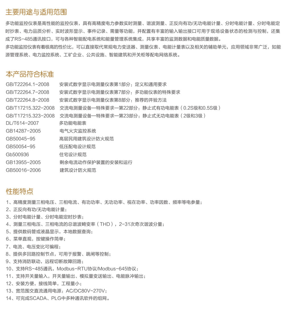 多功能監控儀表是高性能的監控儀表,具有高精度電力參數實(shí)時(shí)測量、諧波測量、正反向有功/無(wú)功電能計量、分時(shí)電能計量、分時(shí)電能定時(shí)抄表、電力品質(zhì)分析、實(shí)時(shí)波形顯示、事件記錄、需量等功能,并配置有豐富的輸入輸出接口可用于現場(chǎng)設備狀態(tài)的檢測與控制,還集成了RS-485通訊按口,可與各種智能配電系統和能量管理系統集成,共享豐富的檢測數據和電能質(zhì)量數據。