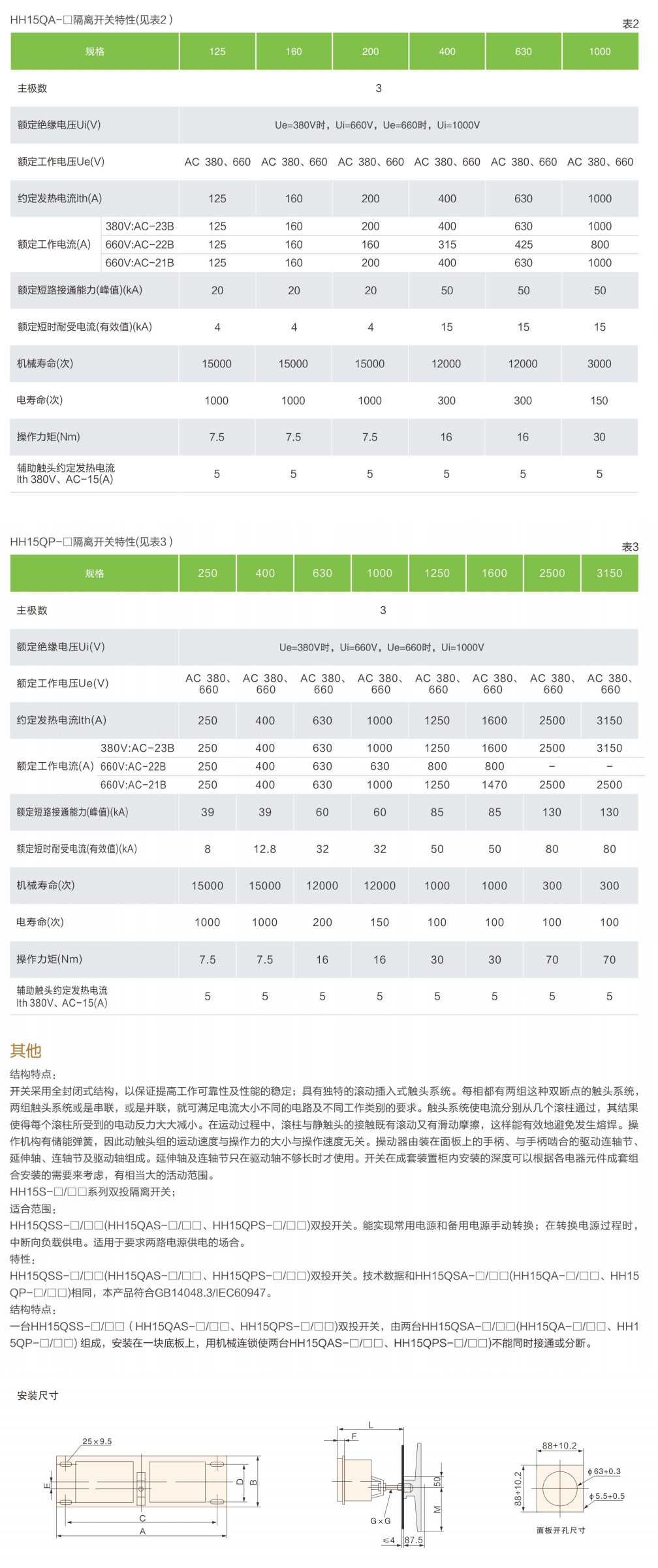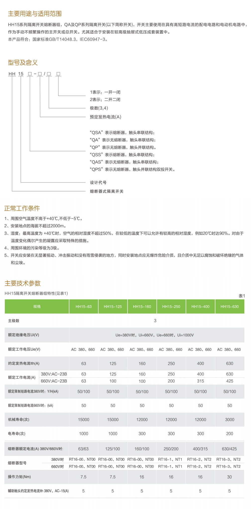 HH15系列隔離開(kāi)關(guān)熔斷器組,QA及QP系列隔離開(kāi)關(guān),開(kāi)關(guān)主要使用在具有高短路電流的配電電路和電動(dòng)機電路中,作為手動(dòng)不頻繁操作的主開(kāi)關(guān)或總開(kāi)關(guān)。尤其適用于安裝在較高級抽屜式低壓成套裝置中。